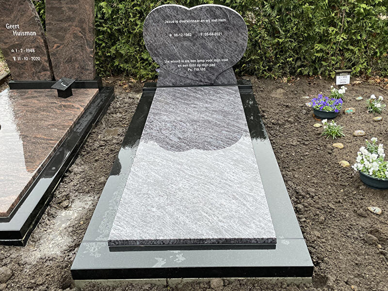 Dit mooie grafmonument hebben we in november 2021 geplaatst op de Hervormde begraafplaats in Usselo. Het kopstukje is in de vorm van een asymmetrisch hart, wat het grafmonument een lieflijke uitstraling geeft. Er is gekozen voor gezandstraalde grafsteen tekst, dat met zilverkleurige verf is ingekleurd. Het kopstukje is uitgevoerd in de kleur Orion.
