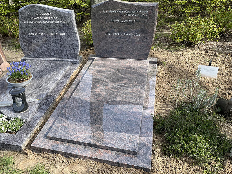 Het kopstukje van dit prachtige grafmonument is in de vorm van een assymetrische waaier. De strakke vormen geven het grafmonument een bijzonder effect. Het grafmonument is volledig uitgevoerd in de kleur Himalayan graniet. De hoogteverschillen in de grafzerk (het liggende gedeelte van de grafsteen) geven de grafsteen een extra laag diepte.